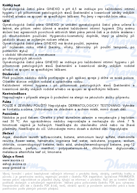 Gynekologická čisticí pěna GINEXID s pH 4,5 se indikuje pro každodenní intimní hygienu i při přítomnosti patologických stavů (bakteriální a kvasinkové záněty vnějších rodidel) a/nebo ve spojení se specifickými léčbami. Pro ženy v reprodukčním věku.