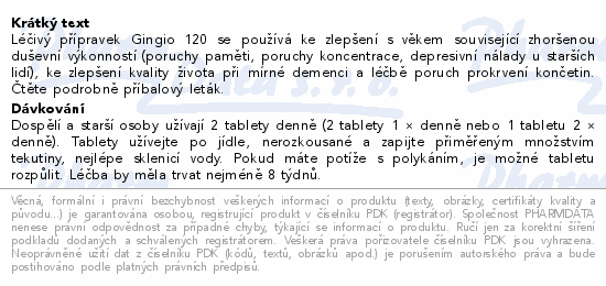 Léčivý přípravek Gingio 120 se používá ke zlepšení s věkem související zhoršenou duševní výkonností (poruchy paměti, poruchy koncentrace, depresivní nálady u starších lidí), ke zlepšení kvality života při mírné demenci a léčbě poruch prokrvení končetin. Čtěte pozorně příbalový leták.