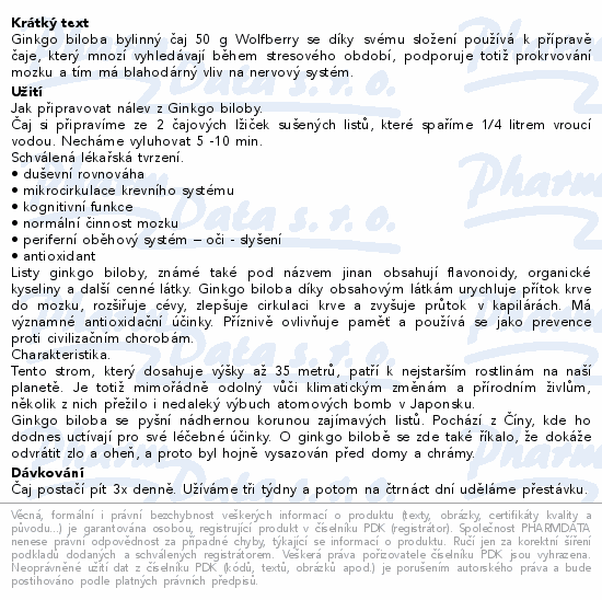 Ginkgo biloba bylinný čaj 50 g Wolfberry se díky svému složení používá k přípravě čaje, který mnozí vyhledávají během stresového období, podporuje totiž prokrvování mozku a tím má blahodárný vliv na nervový systém.