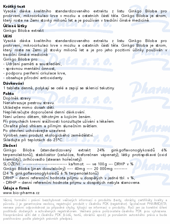 Vysoká dávka kvalitního standardizovaného extraktu z listu Ginkgo Biloba pro prokrvení, mikrocirkulaci krve v mozku a ostatních částí těla. Ginkgo Biloba je strom, který roste na Zemi stovky milionů let a je používán v tradiční čínské medicíně.