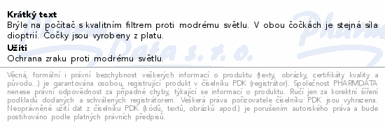 Brýle na počítač s kvalitním filtrem proti modrému světlu. V obou čočkách je stejná síla dioptrií. Čočky jsou vyrobeny z platu.