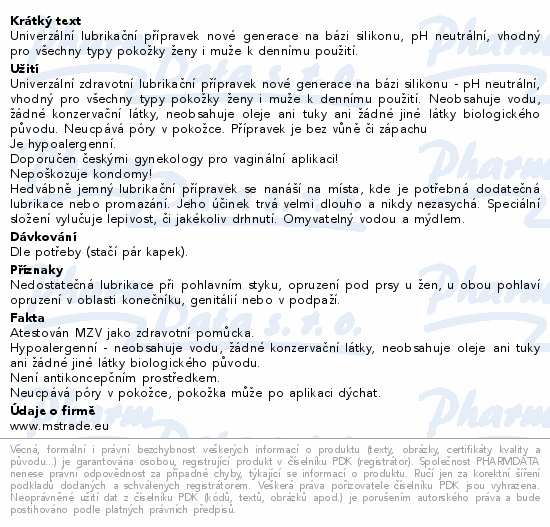 Univerzální lubrikační přípravek nové generace na bázi silikonu, pH neutrální, vhodný pro všechny typy pokožky ženy i muže k dennímu použití.
