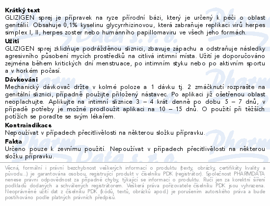 GLIZIGEN sprej je přípravek na ryze přírodní bázi, který je určený k péči o oblast genitálií. Obsahuje 0,1% kyselinu glycyrrhizinovou, která zabraňuje replikaci virů herpes simplex I, II, herpes zoster nebo humánního papillomaviru ve všech jeho formách.