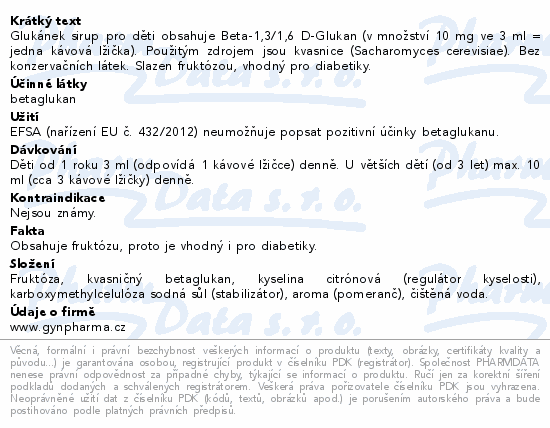 Glukánek sirup pro děti obsahuje Beta-1,3/1,6 D-Glukan (v množství 10 mg ve 3 ml = jedna kávová lžička). Použitým zdrojem jsou kvasnice (Sacharomyces cerevisiae). Bez konzervačních látek. Slazen fruktózou, vhodný pro diabetiky.