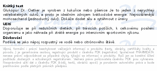 Glukopur Dr. Oetker je vyroben z kukuřice nebo pšenice Je to jeden z nejrychleji vstřebatelných cukrů, a proto je ideálním zdrojem krátkodobé energie. Nejrozšířenější monosacharid (jednoduchý cukr). Dokáže dodat sílu a vytáhnout z únavy.