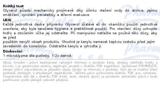 Glycerol působí mechanicky projímavě díky účinku vtažení vody do stolice, jejímu změkčení, vyvolání peristaltiky a střevní evakuace.