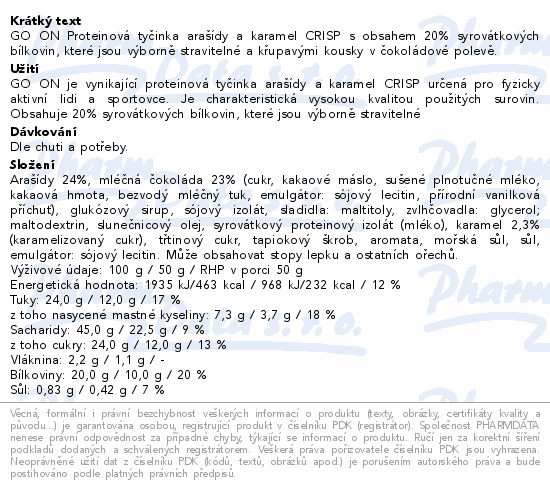 GO ON Proteinová tyčinka arašídy a karamel CRISP s obsahem 20% syrovátkových bílkovin, které jsou výborně stravitelné a křupavými kousky v čokoládové polevě.
