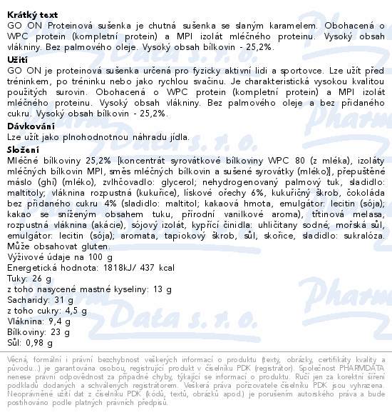 GO ON Proteinová sušenka je chutná sušenka se slaným karamelem. Obohacená o WPC protein (kompletní protein) a MPI izolát mléčného proteinu. Vysoký obsah vlákniny. Bez palmového oleje. Vysoký obsah bílkovin - 25,2%.