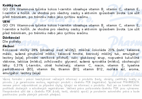 GO ON Vitaminová tyčinka kokos l-carnitin obsahuje vitamin B, vitamin C, vitamin E, l-carnitin a hořčík. Je vhodná pro všechny osoby s aktivním způsobem života. Lze užít před tréninkem, po tréninku nebo jako rychlou svačinu.