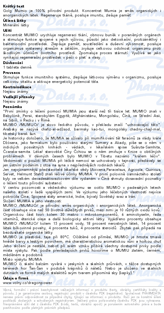 Golg Mumio je 100% přírodní produkt. Koncentrat Mumia je směs organických i anorganických látek. Regeneruje tkáně, posiluje imunitu, zlešuje paměť.