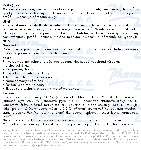Měkké želé bonbony ve tvaru hvězdiček s jahodovou příchutí, bez přidaných cukrů, s vysokým obsahem vlákniny. Oblíbená svačinka pro děti od 3 let, ideální na cesty i do batůžku. Obsahuje přirozené cukry.