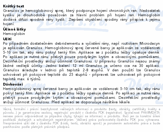Granulox je hemoglobinový sprej, který podporuje hojení chronických ran. Nedostatek kyslíku je dlouhodobě považován za hlavní problém při hojení ran. Hemoglobin dodává difúzí spodině rány kyslík. Zlepšení okysličení spodiny rány přispívá k jejímu hojení.