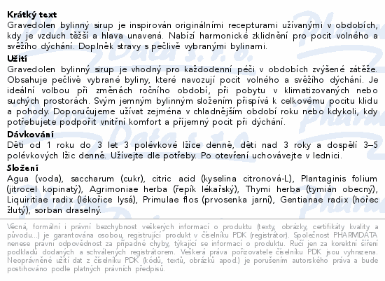 Gravedolen bylinný sirup je inspirován originálními recepturami užívanými v obdobích, kdy je vzduch těžší a hlava unavená. Nabízí harmonické zklidnění pro pocit volného a svěžího dýchání. Doplněk stravy s pečlivě vybranými bylinami.