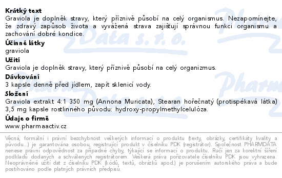 Graviola je doplněk stravy, který příznivě působí na celý organismus. Nezapomínejte, že zdravý zapůsob života a vyvážená strava zajišťují správnou funkci organismu a zachování dobré kondice.