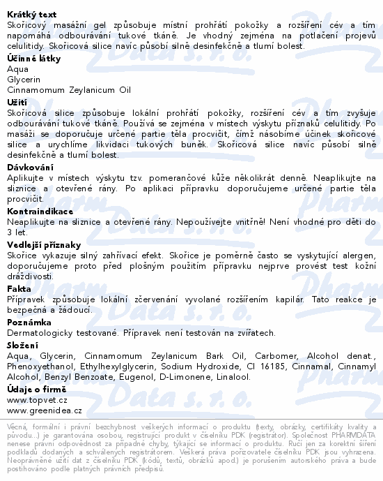 Skořicový masážní gel způsobuje místní prohřátí pokožky a rozšíření cév a tím napomáhá odbourávání tukové tkáně. Je vhodný zejména na potlačení projevů celulitidy. Skořicová silice navíc působí silně desinfekčně a tlumí bolest.