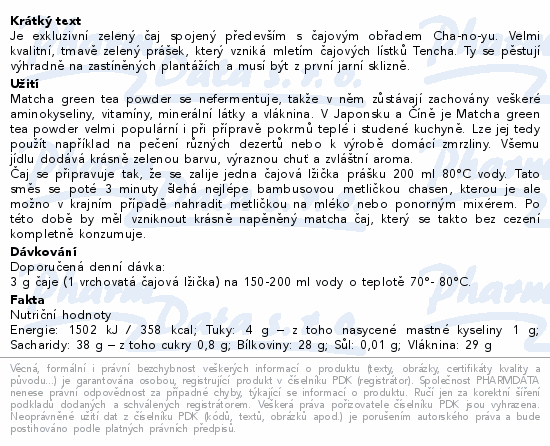 Je exkluzivní zelený čaj spojený především s čajovým obřadem Cha-no-yu. Velmi kvalitní, tmavě zelený prášek, který vzniká mletím čajových lístků Tencha. Ty se pěstují výhradně na zastíněných plantážích a musí být z první jarní sklizně.