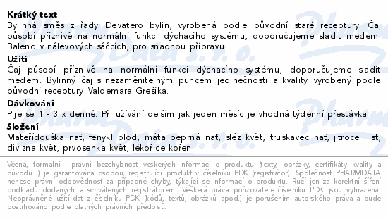 Bylinná směs z řady Devatero bylin, vyrobená podle původní staré receptury. Mateřídouška, máta a sléz působí příznivě na normální funkci dýchacího systému, doporučujeme sladit medem. Baleno v nálevových sáčcích, pro snadnou přípravu.