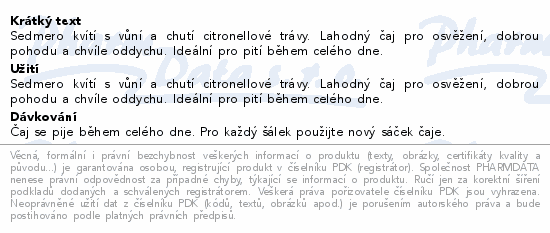Sedmero kvítí s vůní a chutí citronellové trávy. Lahodný čaj pro osvěžení, dobrou pohodu a chvíle oddychu. Ideální pro pití během celého dne.
