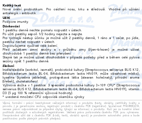 Nové orální probiotikum. Pro osídlení nosu, krku a středouší. Vhodné při užívání antialergik i antibiotik.