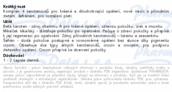 Komplex 4 karotenoidů pro krásné a dlouhotrvající opálení, nově navíc s přírodním zlatem, šafránem, pro rozzáření pleti.