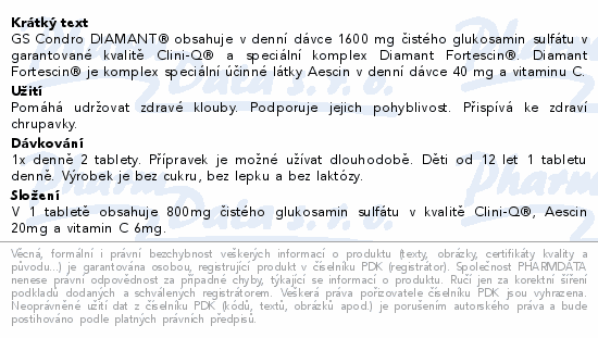 GS Condro DIAMANT® obsahuje v denní dávce 1600 mg čistého glukosamin sulfátu v garantované kvalitě Clini-Q® a speciální komplex Diamant Fortescin®. Diamant Fortescin® je komplex speciální účinné látky Aescin v denní dávce 40 mg a vitaminu C.