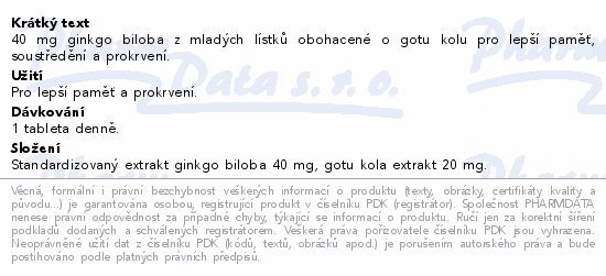 40 mg ginkgo biloba z mladých lístků obohacené o gotu kolu pro lepší paměť, soustředění a prokrvení.