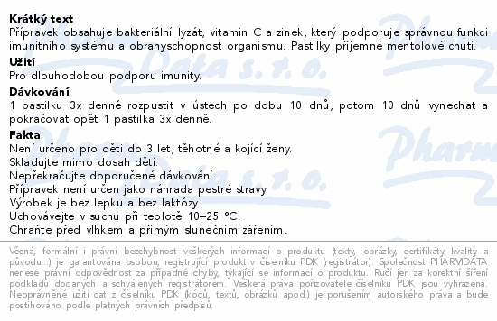 Přípravek obsahuje bakteriální lyzát, vitamin C a zinek, který podporuje správnou funkci imunitního systému a obranyschopnost organismu. Pastilky příjemné mentolové chuti.