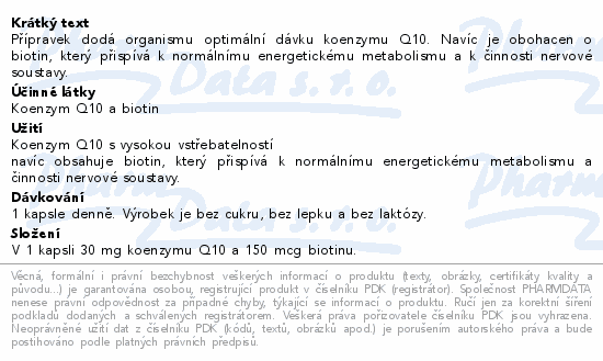 Jedna kapsle obsahuje: koenzym Q10 30 mg, biotin 150 mcg (300 % RHP*).