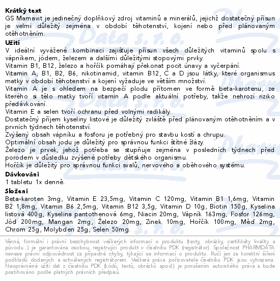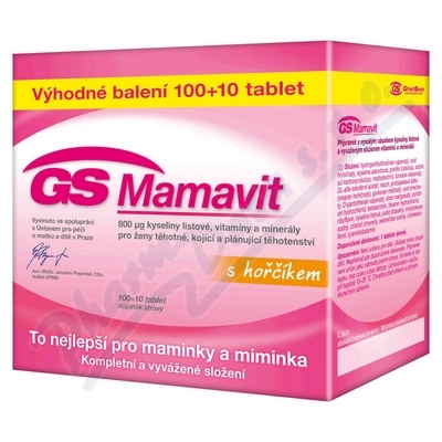 GS Mamavit je jedinečný doplňkový zdroj vitaminů a minerálů, jejichž dostatečný přísun je velmi důležitý zejména v období těhotenství, kojení nebo před plánovaným otěhotněním.