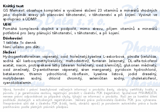 GS Mamavit obsahuje kompletní a vyvážené složení 23 vitamínů a minerálů vhodných jako doplněk stravy při plánování těhotenství, v těhotenství a při kojení. Vyvinut ve spolupráci s ÚDMP.