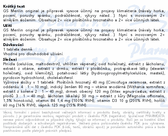 GS Merilin original je přípravek vysoce účinný na projevy klimakteria (návaly horka, pocení, poruchy spánku, podrážděnost, výkyvy nálad…). Nyní s inovovaným 2× silnějším složením. Obsahuje 2× více ploštičníku hroznatého a 2× více účinných látek.