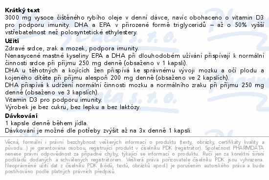 3000 mg vysoce čištěného rybího oleje v denní dávce, navíc obohaceno o vitamin D3 pro podporu imunity. DHA a EPA v přirozené formě triglyceridů – až o 50% vyšší vstřebatelnost než polosyntetické ethylestery.