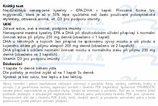Nejdůležitější nenasycené kyseliny – EPA,DHA v kapsli. Přirozená forma tzv. triglyceridů, která je až o 50% lépe využitelná než často používané polosyntetické etylestery, citrusové aroma, vit. D3 pro podporu imunity.