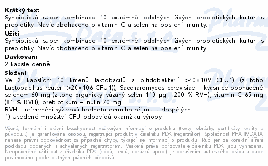 Synbiotická super kombinace 10 extrémně odolných živých probiotických kultur s prebiotiky. Navíc obohaceno o vitamin C a selen na posílení imunity.