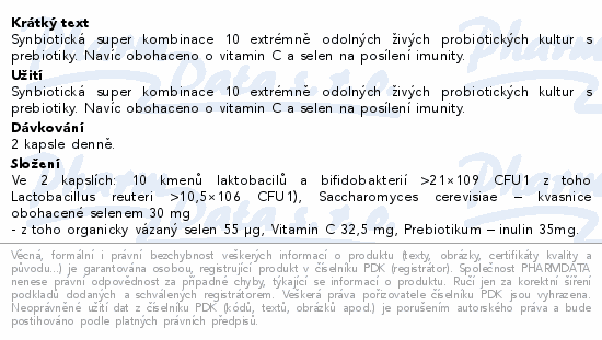 Synbiotická super kombinace 10 extrémně odolných živých probiotických kultur s prebiotiky. Navíc obohaceno o vitamin C a selen na posílení imunity.