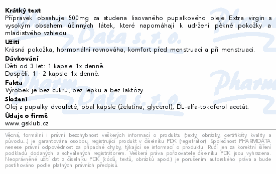 Přípravek obsahuje 500mg za studena lisovaného pupalkového oleje Extra virgin s vysokým obsahem účinných látek, které napomáhají k udržení pěkné pokožky a mladistvého vzhledu.