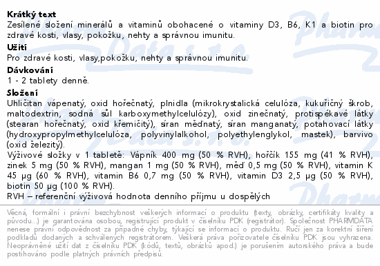 Zesílené složení minerálů a vitaminů obohacené o vitaminy D3, B6, K1 a biotin pro zdravé kosti, vlasy, pokožku, nehty a správnou imunitu.