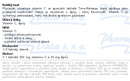 Přípravek obsahuje vitamin C ve speciální tabletě Time-Release, která zajišťuje jeho postupné uvolňování. Navíc je obohacen o šípky – zdroj flavonoidů. Vitamin C je významný antioxidant, který má široké spektrum působení.