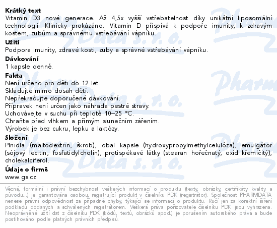 Vitamin D3 nové generace. Až 4,5x vyšší vstřebatelnost díky unikátní liposomální technologii. Klinicky prokázáno. Vitamin D přispívá k podpoře imunity, k zdravým kostem, zubům a správnému vstřebávání vápníku.