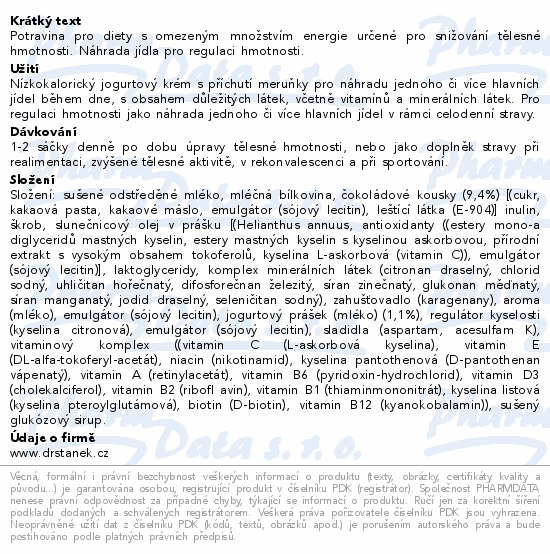 Potravina pro diety s omezeným množstvím energie určené pro snižování tělesné hmotnosti. Náhrada jídla pro regulaci hmotnosti.