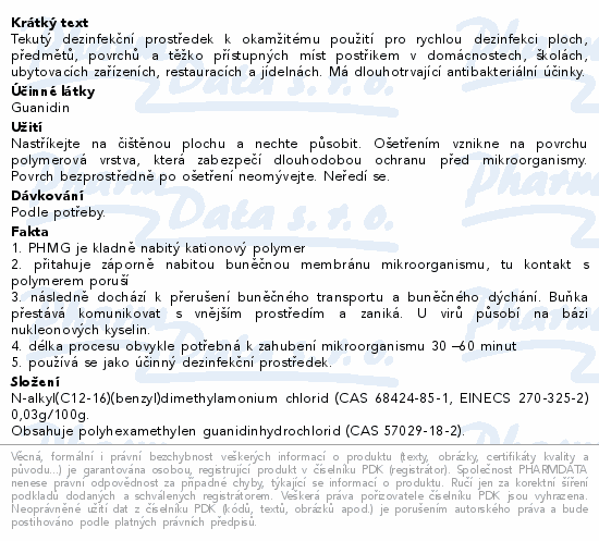 Tekutý dezinfekční prostředek k okamžitému použití pro rychlou dezinfekci ploch, předmětů, povrchů a těžko přístupných míst postřikem v domácnostech, školách, ubytovacích zařízeních, restauracích a jídelnách. Má dlouhotrvající antibakteriální účinky.