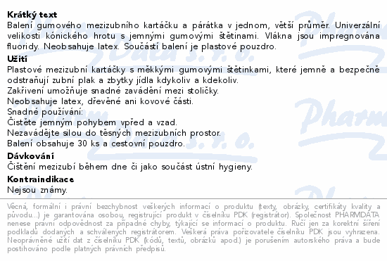 Balení gumového mezizubního kartáčku a párátka v jednom, větší průměr. Univerzální velikosti kónického hrotu s jemnými gumovými štětinami. Vlákna jsou impregnována fluoridy. Neobsahuje latex. Součástí balení je plastové pouzdro.
