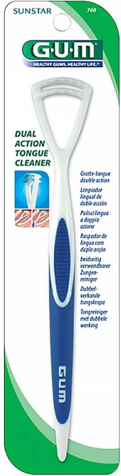 Škrabka na odstranění plaku z jazyka. Z jedné strany je velmi šikovná škrabka a z druhé strany je kartáček na jazyk.