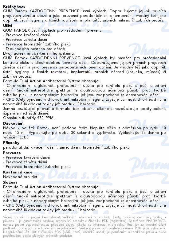GUM Paroex KAŽDODENNÍ PREVENCE ústní výplach. Doporučujeme jej při prvních projevech zánětu dásní a jako prevenci parodontálních onemocnění, vhodný též jako doplněk ústní hygieny u fixních rovnátek, implantátů, zubních náhrad či zubních protéz.