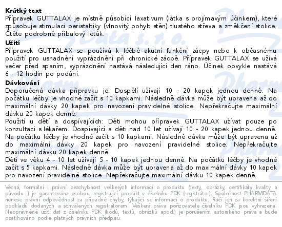 Přípravek GUTTALAX je místně působící laxativum (látka s projímavým účinkem), které způsobuje stimulaci peristaltiky (vlnovitý pohyb stěn) tlustého střeva a změkčení stolice. Čtěte pozorně příbalový leták.