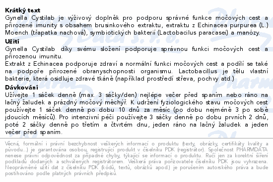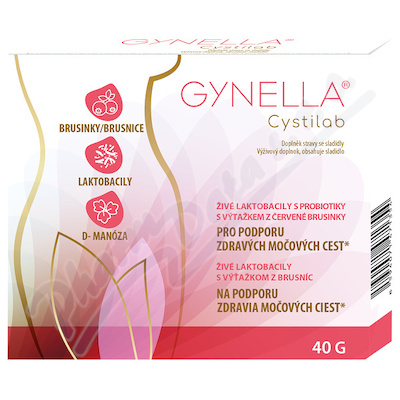 Gynella Cystilab je výživový doplněk pro podporu správné funkce močových cest a přirozené imunity s obsahem brusinkového extraktu, extraktu z Echinacea purpurea (L.) Moench (třapatka nachová), symbiotických bakterií (Lactobacilus paracasei) a manózy.