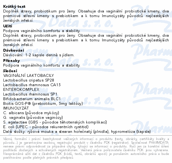 Doplněk stravy, probiotikum pro ženy. Obsahuje dva vaginální probiotické kmeny, dva prémiové střevní kmeny s prebiotikem a k tomu ImunoLyzáty původců nejčastějších ženských infekcí.