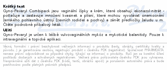 Gyno-Pevaryl Combipack jsou vaginální čípky a krém, které obsahují ekonazol-nitrát - potlačuje a zastavuje množení kvasinek a plísní, které mohou vyvolávat onemocnění ženského pohlavního ústrojí (zevních rodidel a pochvy) a zánět předkožky žaludu u m. Čtěte pozorně příbalový leták.