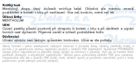 Mentolový drops, který dočasně zmírňuje kašel. Chladivá síla mentolu zmenší podráždění a bolesti v krku při nachlazení. Více než bonbón, méně než lék.