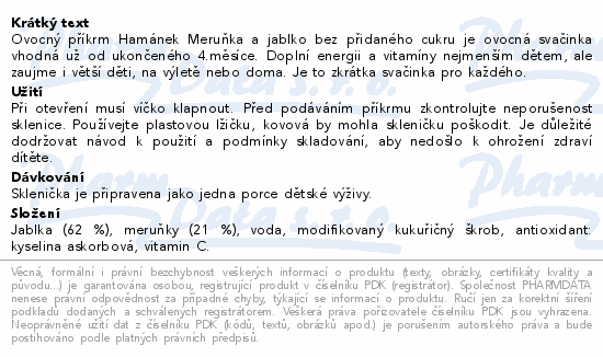 Ovocný příkrm Hamánek Meruňka a jablko bez přidaného cukru je ovocná svačinka vhodná už od ukončeného 4.měsíce. Doplní energii a vitamíny nejmenším dětem, ale zaujme i větší děti, na výletě nebo doma. Je to zkrátka svačinka pro každého.